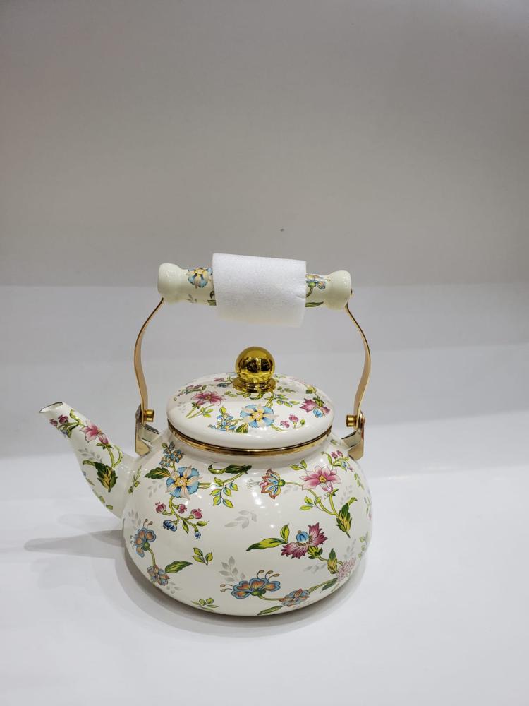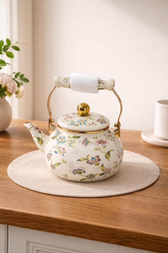 إبريق شاي مصنوع من المعدن المطلي بالمينا عالية الجودة، مزين بنقوش زهرية ملونة بألوان هادئة تجمع بين الأزرق، الوردي، والأخضر على خلفية عاجية ناعمة تعكس ذوقًا راقيًا ومشرقًا.