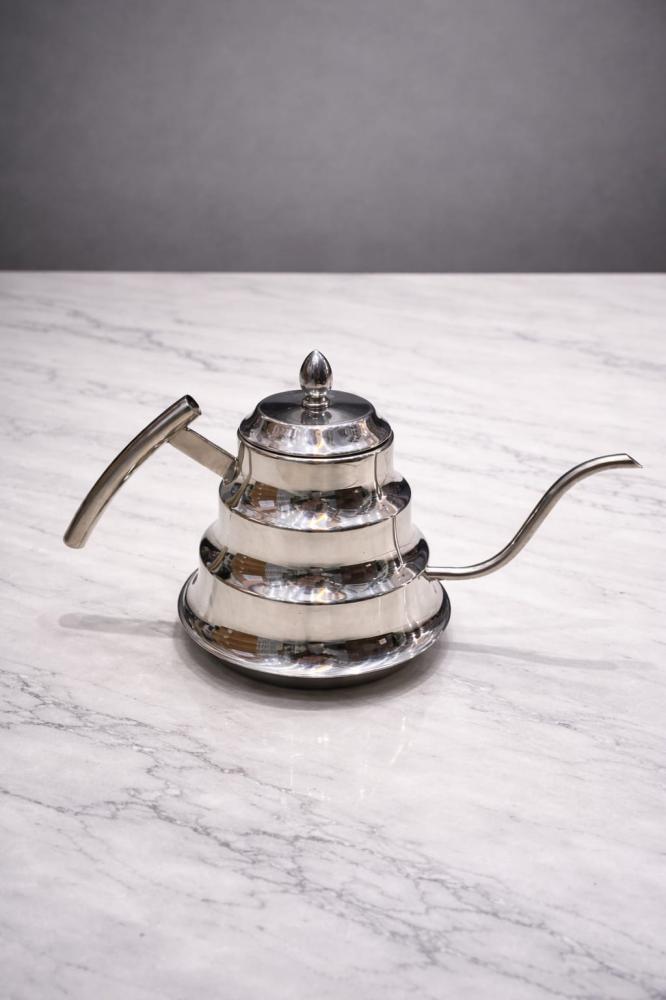 دلة تقديم أنيقة بتصميم متوازن يجمع بين الطابع العصري والفخامة الكلاسيكية، مصنوعة من معدن عالي الجودة بلمعة راقية تعكس الذوق الرفيع. تتميز بشكلها الطبقي المتناسق الذي يمنحها حضورًا لافتًا على طاولة التقديم، مع مقبض مريح وصبّابة مصممة بدقة لتسهيل الاستخدام.