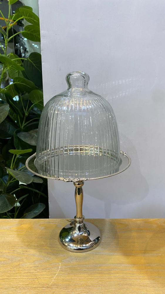 وصف المنتجقاعدة تقديم معدنية أنيقة بارتفاع مثالي، مغطاة بقبة زجاجية مخططة تضيف لمسة كلاسيكية راقية. التصميم يمنح تهوية مثالية مع الحفاظ على جمالية ال...
