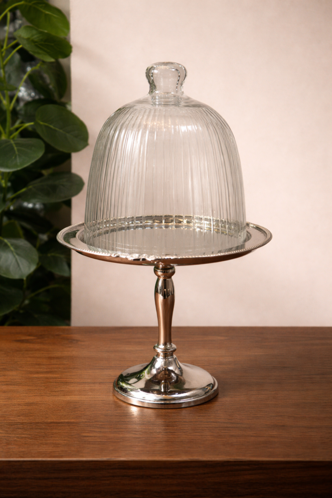 قاعدة تقديم معدنية أنيقة بارتفاع مثالي، مغطاة بقبة زجاجية مخططة تضيف لمسة كلاسيكية راقية. التصميم يمنح تهوية مثالية مع الحفاظ على جمالية العرض، مما يجعله مناسبًا لتقديم الكيك، المعمول، أو الحلويات في المناسبات والضيافات الرسمية.