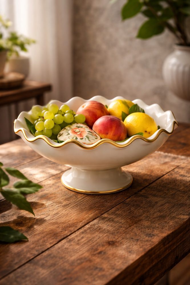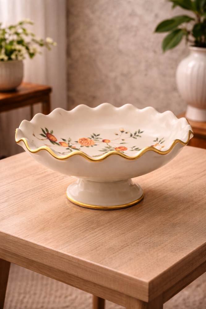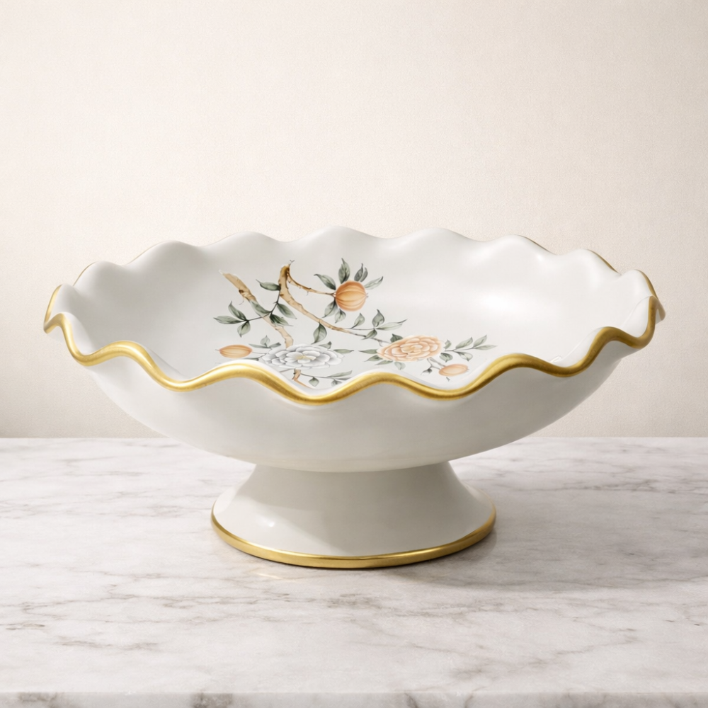 صحن تقديم بقاعدة فاخرة بحافة متموجة ولمسة ذهبية – قطعة مركزية أنيقة