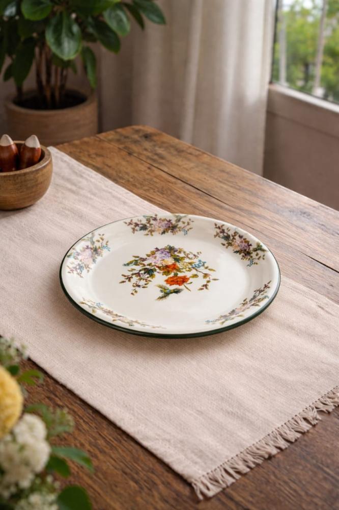 الحواف مزينة بزخارف زهرية متناسقة مع إطار أخضر داكن يبرز جمال الصحن ويمنحه طابعًا كلاسيكيًا راقيًا. النقش مطبوع بدقة عالية ليحافظ على وضوح الألوان وجمالها مع الاستخدام، مما يجعله مناسبًا لتقديم الحلويات، المقبلات، أو الضيافة اليومية بأسلوب أنيق.