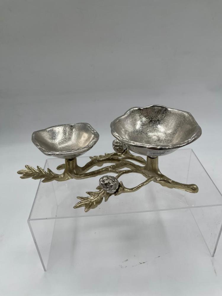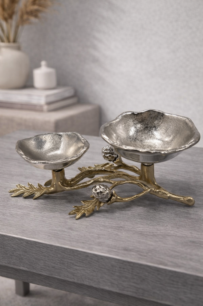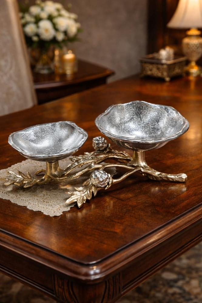 📏 المقاسات: (الطول 30 سم) (قطر الوعاء الكبير 16 سم) (قطر الوعاء الصغير 15 سم)قطعة تقديم مميزة بتصميم نحتي مستوحى من الأغصان الطبيعية وتفاصيل معدنية فا...