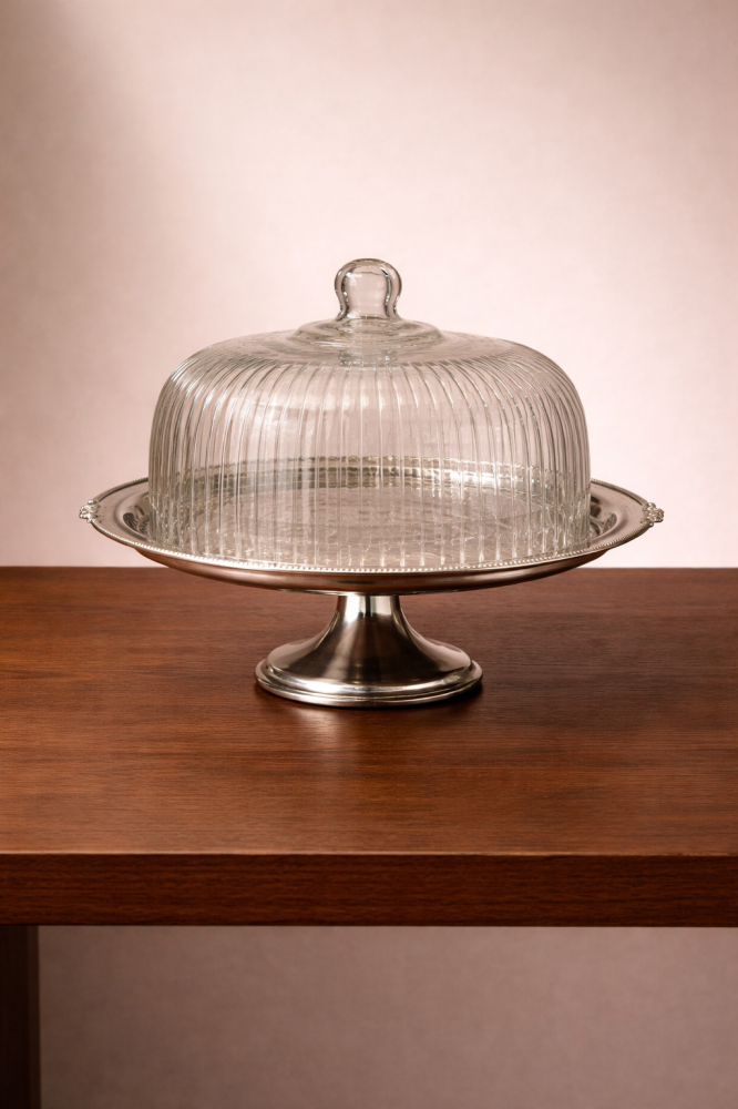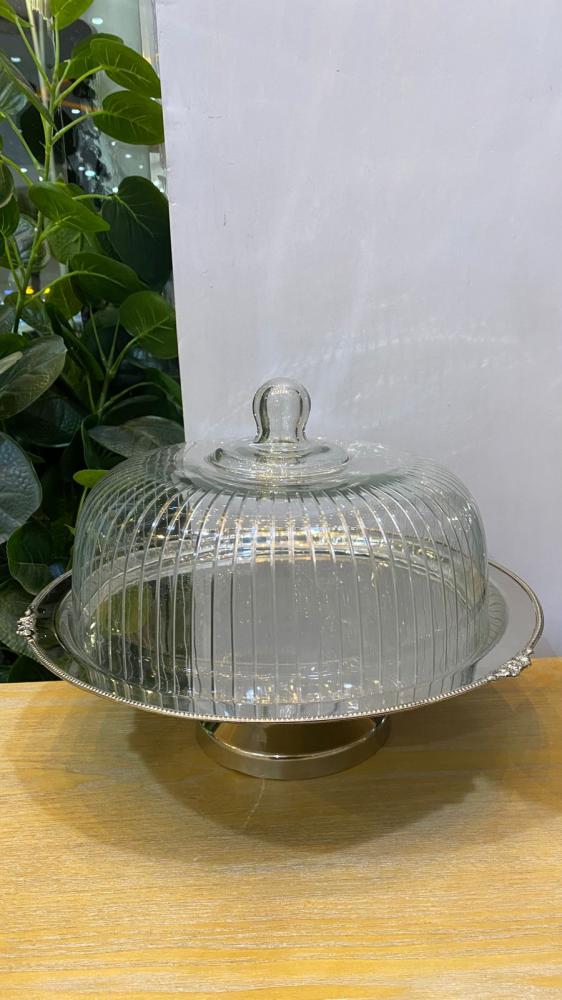 طبق تقديم معدني مزخرف الحواف مع غطاء زجاجي شفاف مخطط بتفاصيل دقيقة. التصميم يمنح مساحة عرض واسعة مثالية للحلويات، المعجنات، أو التقديم في المناسبات الخاصة.
