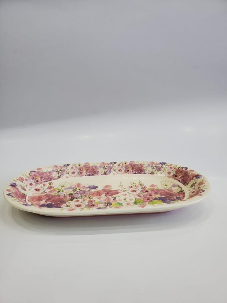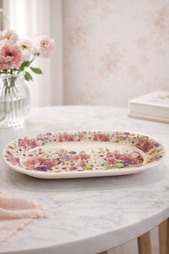 طبق تقديم بيضاوي مسطح مصنوع من بورسلان عالي الجودة، يتميز بسطح أملس ولمعان هادئ يعكس فخامة الخامة ودقة التشطيب. يزين الطبق نقوش زهرية متناسقة بدرجات الوردي والبنفسجي مع لمسات خضراء طبيعية، موزعة بأسلوب فني كلاسيكي يمنح المائدة طابعًا دافئًا وأنيقًا.