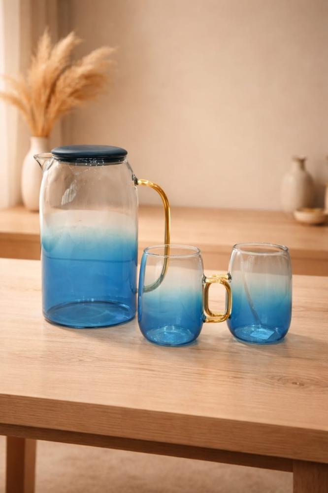 الإبريق مصنوع من زجاج عالي الجودة مع يد مريحة وغطاء أنيق، ويأتي مع أكواب متناسقة بنفس التدرج اللوني ليمنح طاولة التقديم مظهرًا متناسقًا وهادئًا.