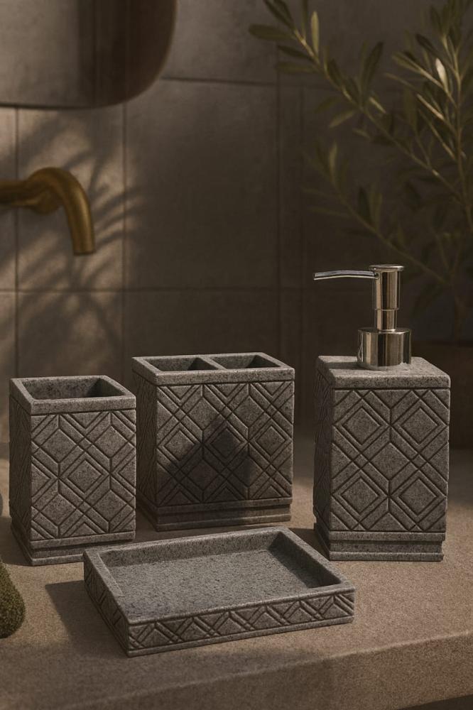 طقم إكسسوارات مغسلة بتصميم أنيق مستوحى من النقش المربّع (الموزاييك)، يمنح المغسلة مظهرًا مرتبًا وفاخرًا في آنٍ واحد. مصنوع من خامة عالية الجودة بلمسة نهائية ناعمة ولون هادئ ينسجم بسهولة مع مختلف أنماط الحمامات، سواء العصرية أو الكلاسيكية.
