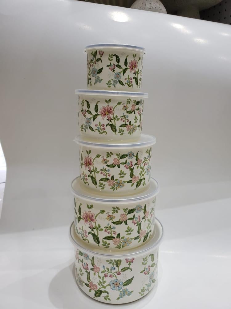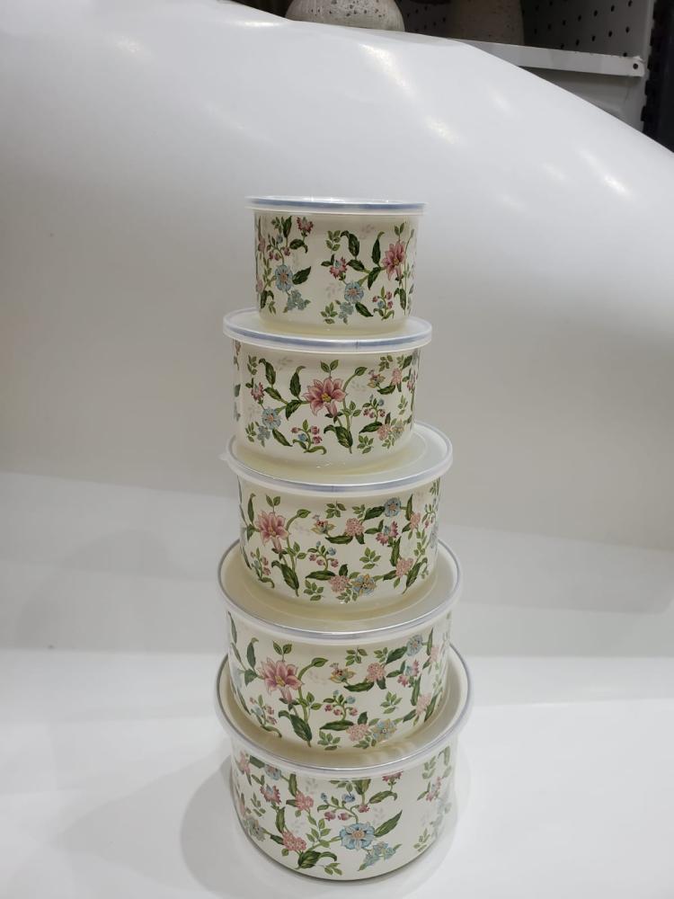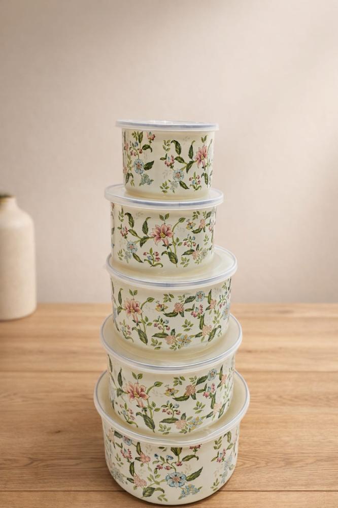 طقم حافظات طعام مكوّن من خمس قطع بأحجام مختلفة، مصمم بنقوش زهرية ناعمة بألوان هادئة تجمع بين الوردي، الأخضر، والأزرق الفاتح على خلفية كريمية أنيقة تعكس إحساسًا بالدفء والرقي.
