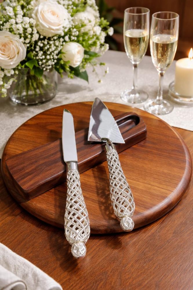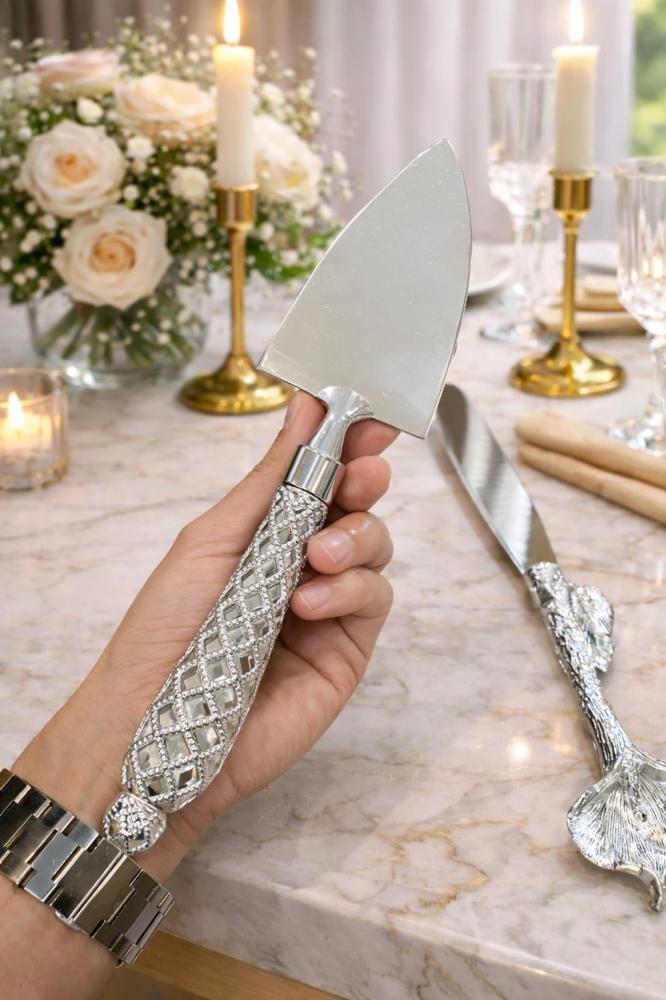 طقم سكين وملعقة تقديم كيك بتصميم راقٍ يجسّد الفخامة في أدق تفاصيله.