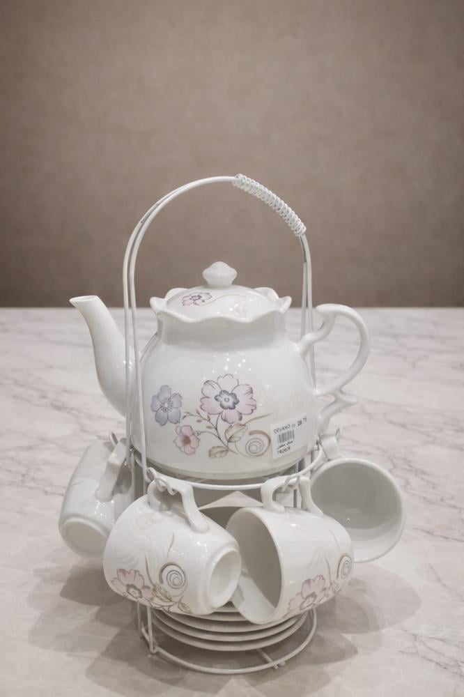 الوصف طقم شاي أنيق مصنوع من البورسلان الأبيض عالي الجودة، مزين بنقوش زهرية ناعمة تضيف لمسة جمالية راقية.يأتي الطقم مع حامل معدني عملي يسهل ترتيب القط...