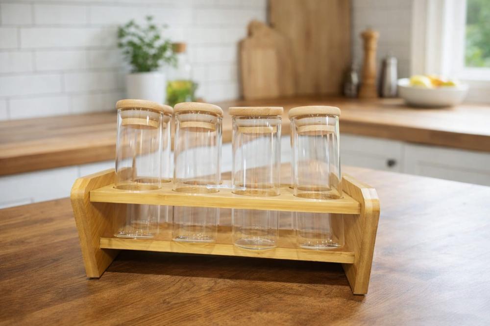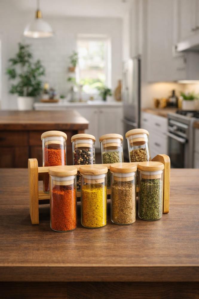 طقم علب بهارات مصنوع من زجاج شفاف مع اغطية خشبية طبيعية يمنحك تنظيما مرتبا وعمليا للبهارات مع مظهر انيق