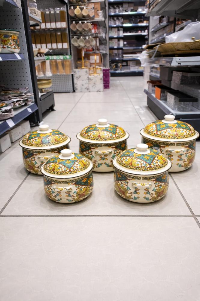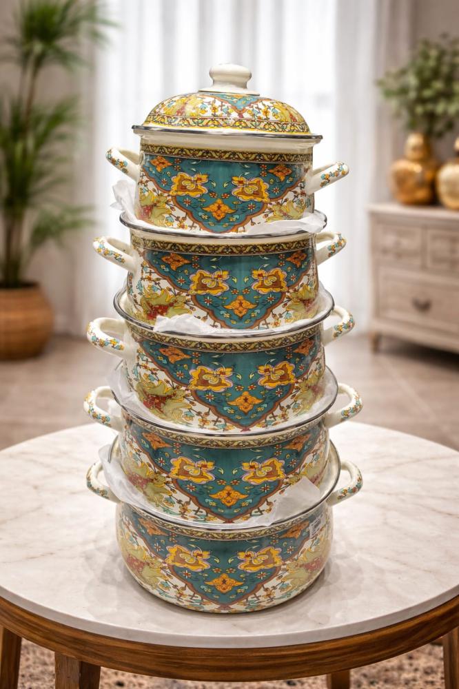 طقم قدور غضار بنقشة تراثية فاخرة – 5 مقاساتطقم قدور غضار بنقشة تراثية فاخرة – 5 مقاسات
