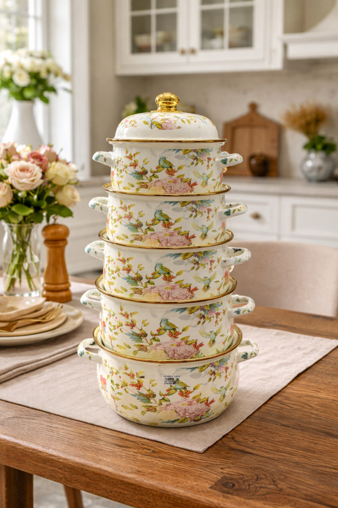 طقم قدور فاخر مصنوع بجودة عالية، يتميز بتصميم مزخرف مستوحى من الطابع الكلاسيكي مع نقوش زهرية دقيقة تمنح مطبخك مظهرًا أنيقًا ومميزًا. يتكون الطقم من عدة أحجام عملية تناسب مختلف احتياجات الطهي اليومية، مع أغطية محكمة تساعد على توزيع الحرارة بشكل متوازن للحفاظ على نكهة الطعام.