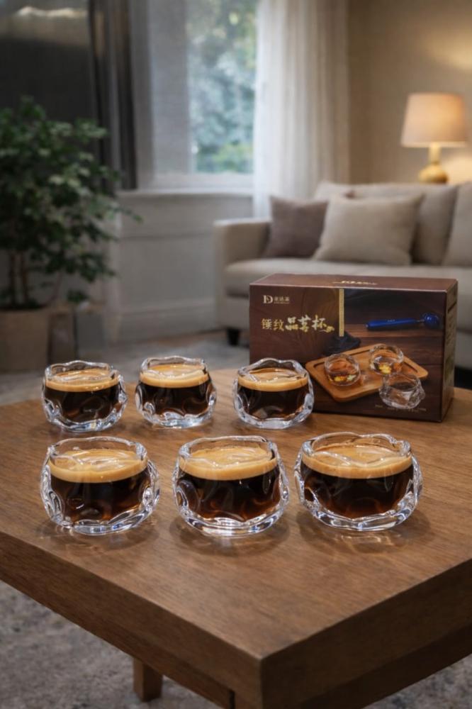 مصنوع من زجاج شفاف عالي الجودة يبرز لون قهوة الإسبريسو ويعكس كثافتها وجمال رغوتها. سماكة الزجاج تمنح الكاسات ثباتًا ممتازًا وتحافظ على حرارة القهوة لفترة أطول، مع حواف ناعمة تضمن تجربة شرب مريحة.