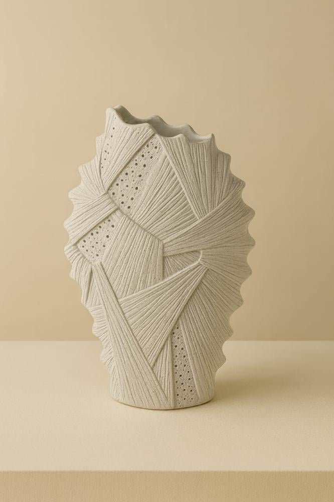 فازة ديكور منزلية مصنوعة من الجبس عالي الجودة، تتميز بتصميم نَحتي هندسي فريد يعتمد على خطوط متداخلة وملمس بارز يمنح القطعة طابعًا فنيًا معاصرًا. اللون العاجي الهادئ يبرز التفاصيل الدقيقة ويجعلها قطعة متناسقة مع مختلف أنماط الديكور العصري والحديث.