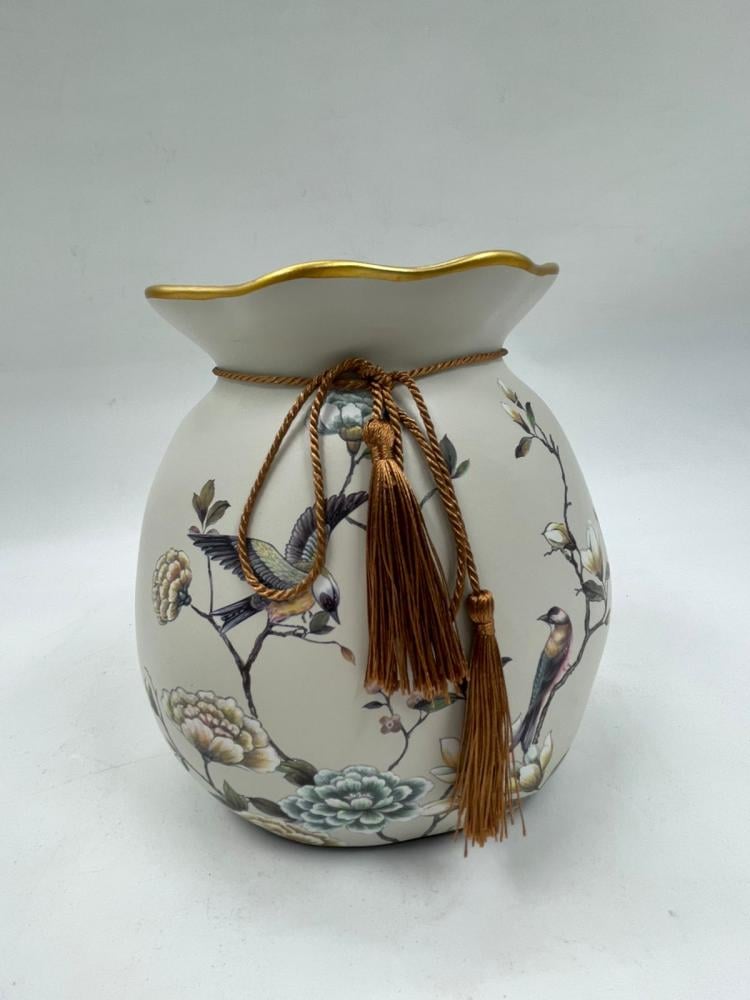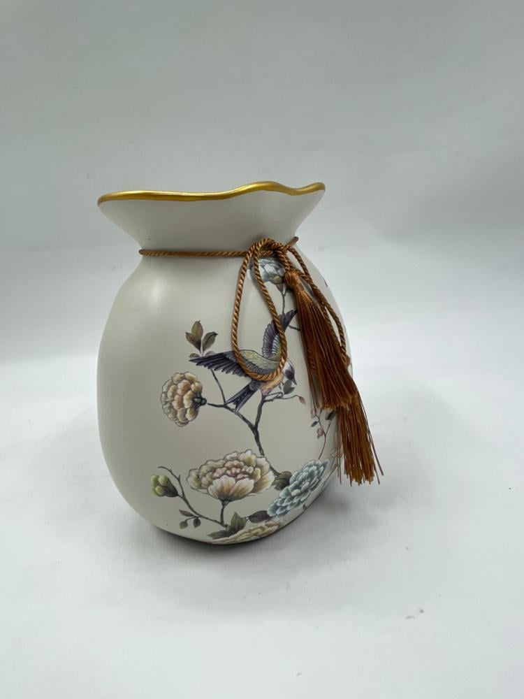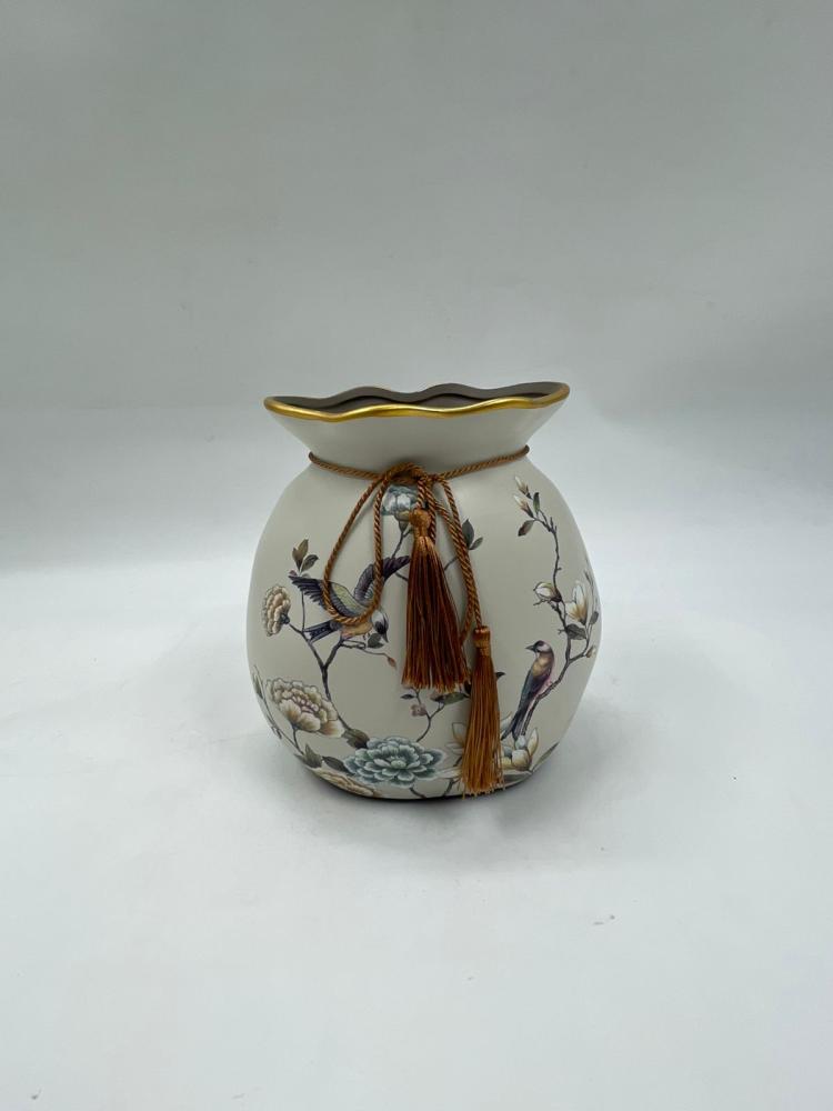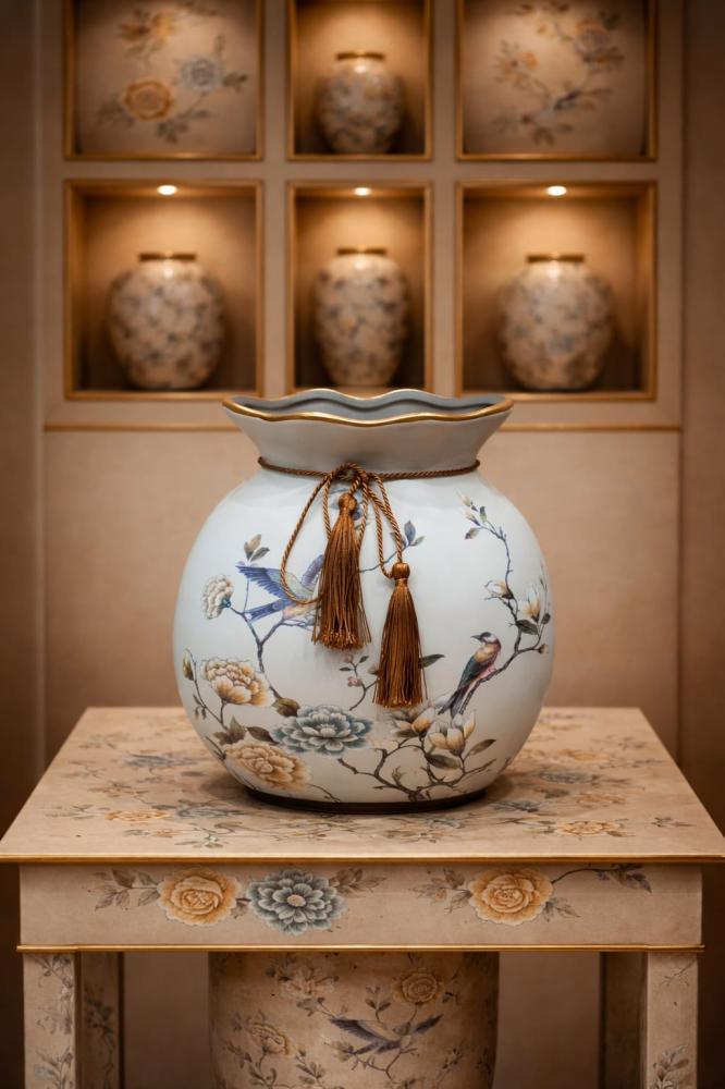 فازة ديكورية مصنوعة من الخزف عالي الجودة بتشطيب ناعم ولون هادئ، مزينة بزخارف زهرية وطيور مرسومة بدقة فنية تعكس الذوق الكلاسيكي الراقي. الحافة العلوية مزخرفة بلمسة ذهبية أنيقة، مع رباط وشرّابات تضيف إحساسًا بالفخامة رغم الحجم الصغير.
