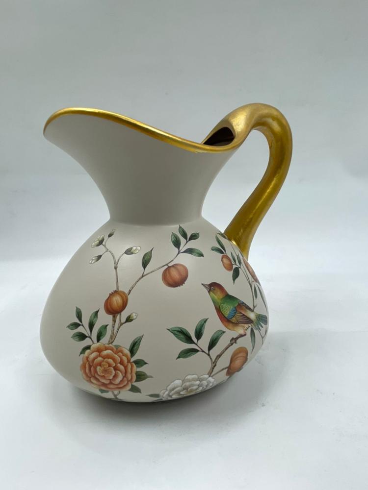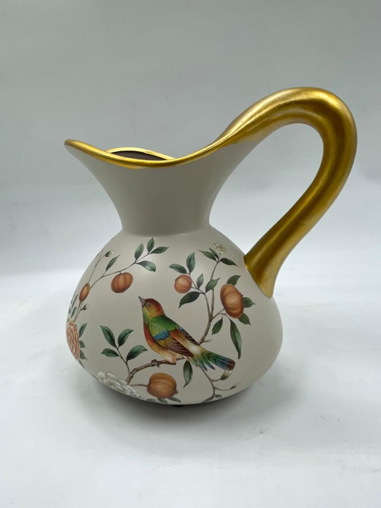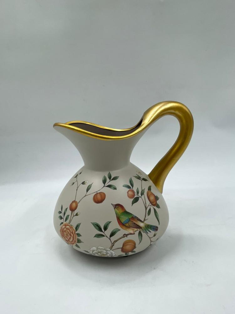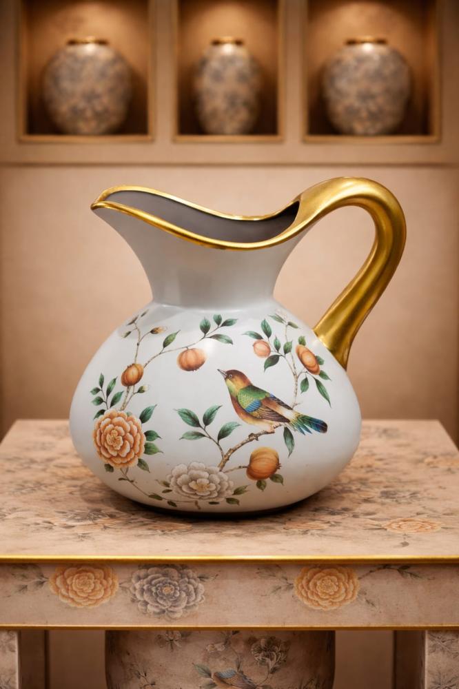 فازة ديكورية مصنوعة من الخزف عالي الجودة، بتصميم دائري أنيق مزخرف برسومات زهرية ناعمة مع طائر مرسوم بدقة فنية تضيف للقطعة طابعًا كلاسيكيًا راقيًا. تتميز بحافة علوية متموجة مع لمسات ذهبية أنيقة تمنحها فخامة واضحة وحضورًا بصريًا جذابًا.