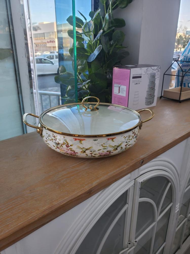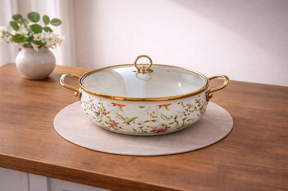 قدر تقديم فاخر بنقوش زهرية وطيور مع غطاء زجاجي ولمسات ذهبية