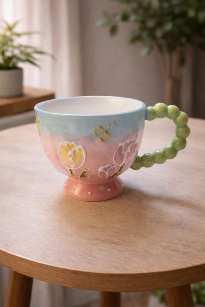 كوب سيراميك بتفاصيل فنية تضيف لمسة تميز لطاولة القهوة. مناسب للاستخدام اليومي أو كقطعة ديكور عملية.