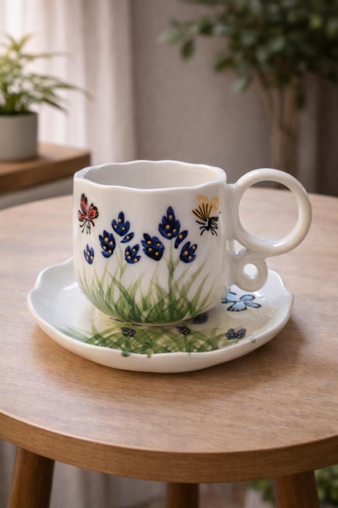 كوب قهوة بنقشة نباتية هادئة، مصنوع من السيراميك عالي الجودة. تصميمه يناسب عشاق البساطة والطبيعة.