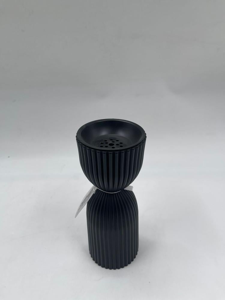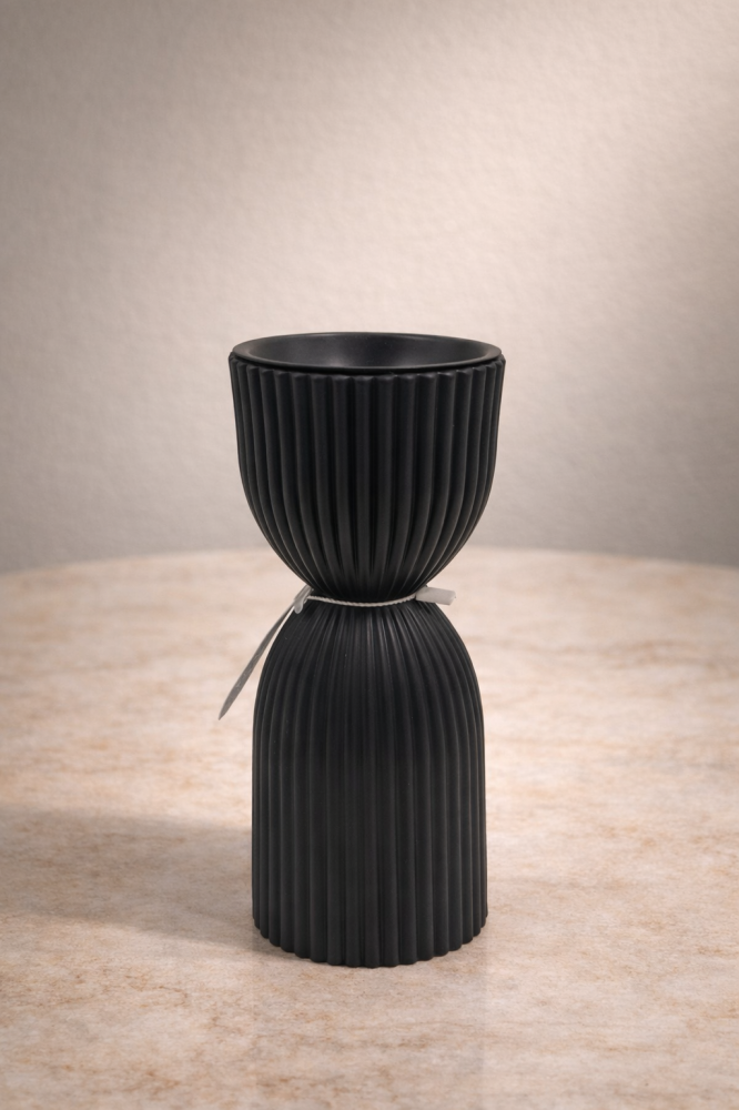 مبخرة بتصميم عصري مميز تأتي بلون أسود مطفي وخطوط عمودية دقيقة تمنحها ملمسًا بصريًا جذابًا وحضورًا أنيقًا. يجمع شكلها المخروطي المتوازن بين البساطة والجرأة، مما يجعلها قطعة ديكور لافتة تتناغم مع المساحات الحديثة وركن القهوة والمجالس العصرية.