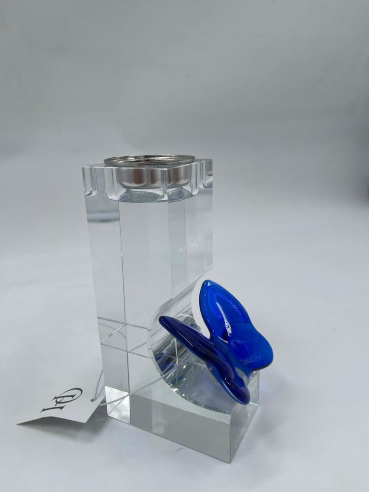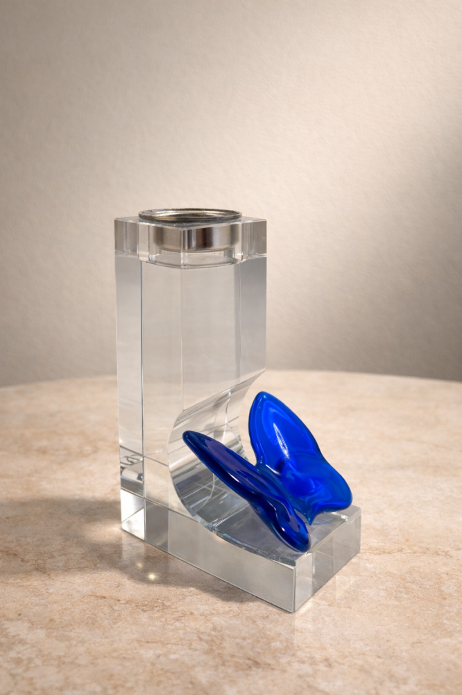 مبخرة كريستال بتصميم عصري فاخر تمزج بين النقاء البصري واللمسة الفنية الهادئة، مصنوعة من زجاج شفاف عالي الجودة مع تفصيلة زجاجية زرقاء انسيابية تضيف طابعًا فريدًا وجاذبية لافتة. يعكس شكلها الهندسي الأنيق جمال البساطة ويجعلها قطعة ديكور مميزة قبل أن تكون مبخرة عملية للاستخدام اليومي.