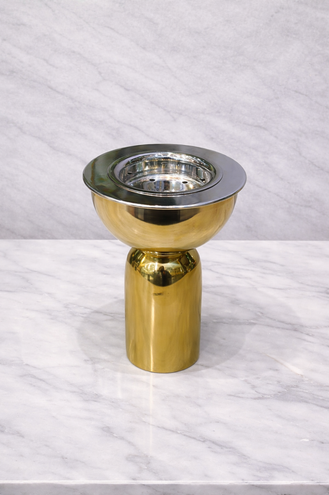 مبخرة أنيقة بتصميم عصري يجمع بين الوعاء المعدني الفضي والقاعدة الذهبية اللامعة، لتشكل قطعة ديكورية راقية تضيف لمسة فخامة واضحة في المجالس وركن الضيافة. تتميز بارتفاع عملي وقاعدة متينة تمنح ثباتاً أثناء الاستخدام، مع وعاء علوي يساعد على توزيع رائحة البخور بانسيابية في المكان.