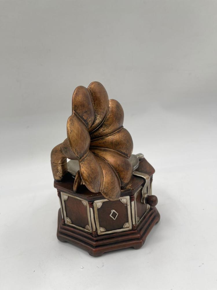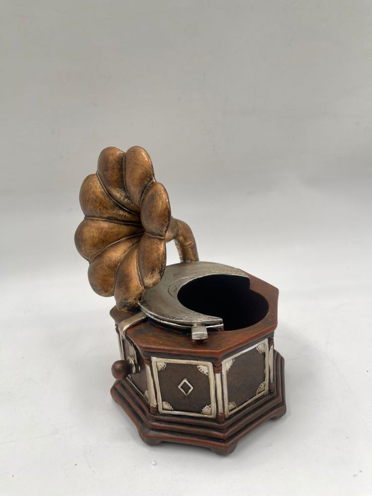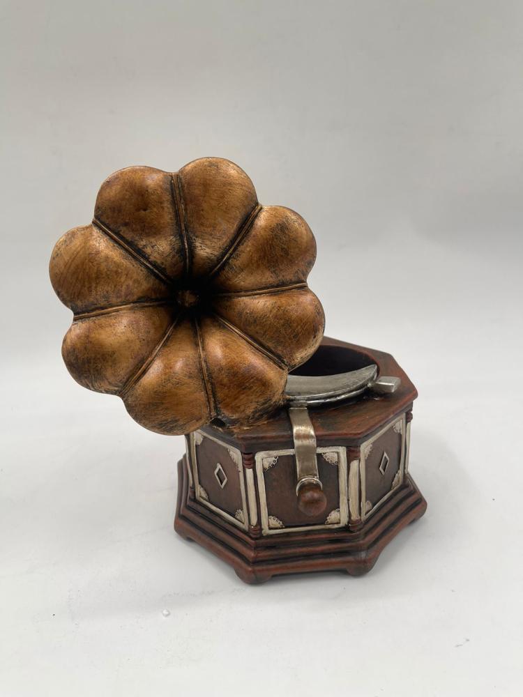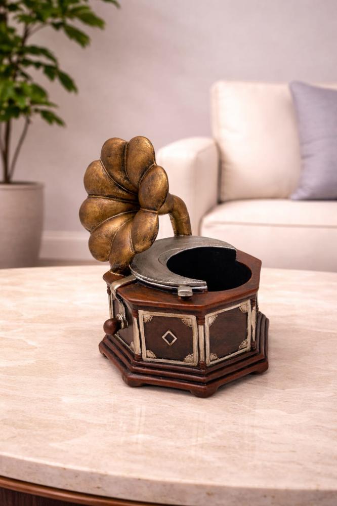 مجسّم ديكوري على شكل غرامافون كلاسيكي بتفاصيل دقيقة تعكس روح العصور القديمة، مع بوق بتشطيب فني وقاعدة مزخرفة تضيف طابعًا تراثيًا أنيقًا. التصميم يجمع بين الخشب والمعدن بلمسات لونية دافئة تمنح القطعة حضورًا فخمًا وجذابًا.