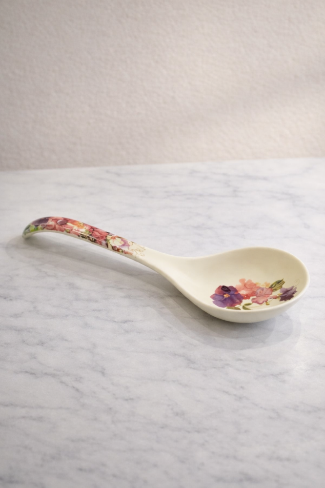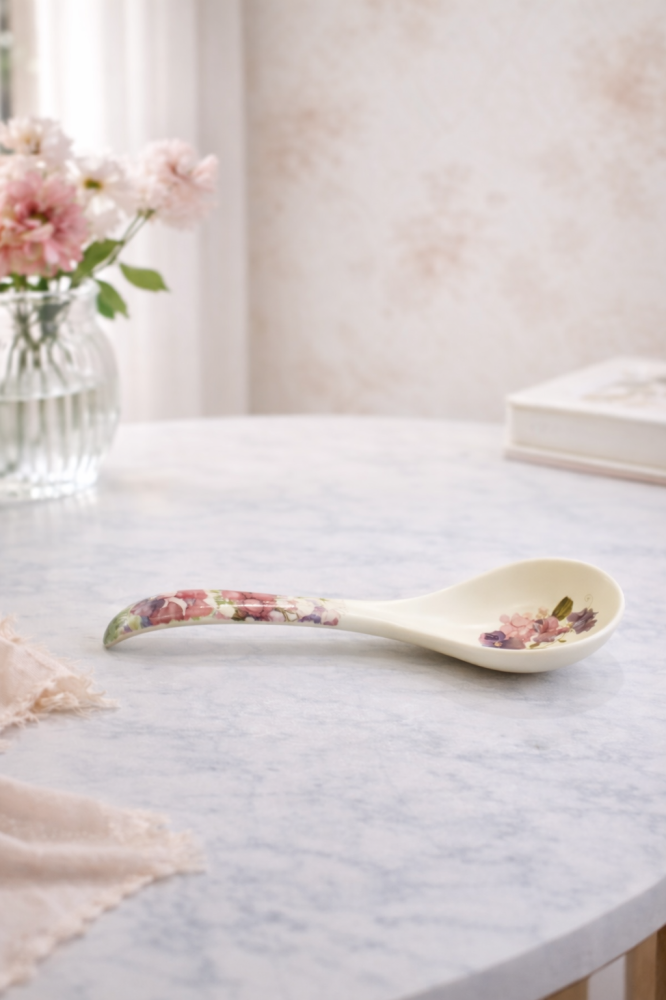 ملعقة تقديم مصنوعة من بورسلان عالي الجودة، تتميز بتصميم انسيابي وقبضة مريحة تسهّل الاستخدام أثناء التقديم أو التحريك. يزينها نقش زهري ناعم بدرجات الوردي والبنفسجي مع لمسات خضراء طبيعية، موزع بعناية على المقبض وداخل رأس الملعقة ليمنحها طابعًا متناسقًا مع باقي قطع المجموعة.